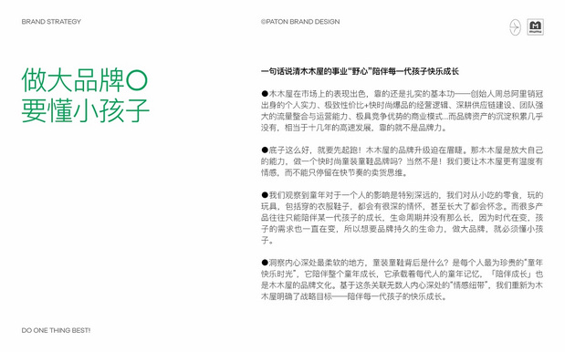 木木屋儿童品牌全案 /><img fetchpriority= 木木屋(MUMUWU)是中国知名儿童品牌,创立于2011年,专注为0-14岁孩子提供时尚、健康、舒适的服饰用品,产品覆盖童装、童鞋、孕产、玩具、用品等全品类,受到超3500万个中国亲子家庭的青睐。品牌屡获天猫《最受中国妈妈喜爱的母婴品牌奖》、唯品会《国内母婴行业TOP品牌》、天猫新零售品牌童鞋销量第一等荣誉,稳坐中国儿童品牌TOP榜。 2022年木木屋与巴顿达成战略合作,从顶层战略到视觉系统对品牌进行全面升级。巴顿从品牌基因出发,为木木屋聚焦更清晰的【陪伴每一代孩子的快乐成长】的战略定位,打造品牌口号【一二三四五,爱穿木木屋】,并重新设计了品牌IP【木木】,升级VI系统,为木木屋建立起全新的品牌资产储蓄罐,真正掌握流量主权,为木木屋的高速发展引擎填充强大的品牌能量。