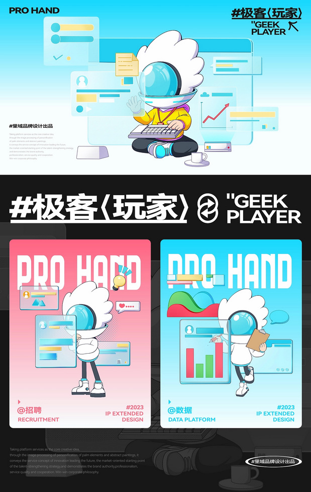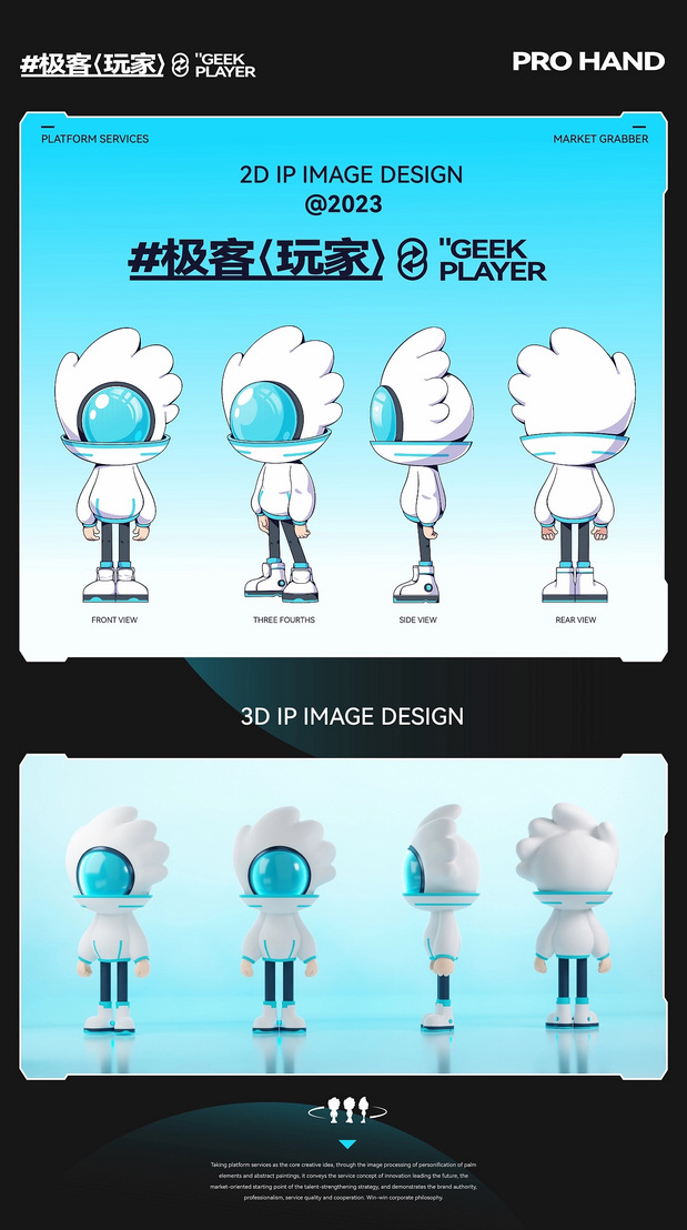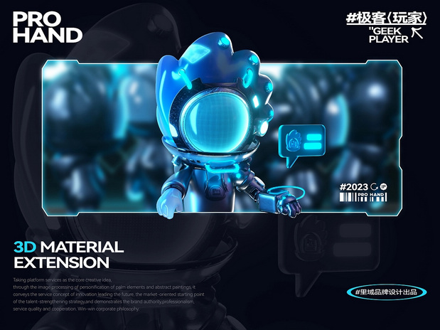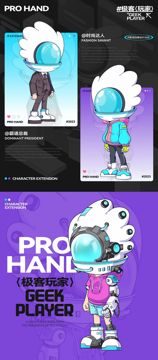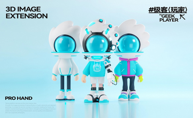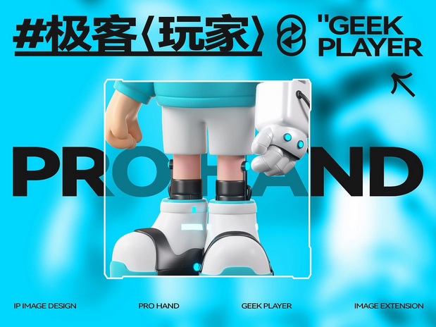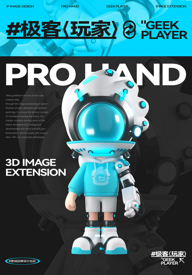 IP形象设计 Project | 极客玩家-PRO HAND 新玩法新机遇-科技行业IP化势如破竹 越来越多的科技品牌选择采用识别度高、记忆点强的IP形象作为自己品牌产品的发声人,通过迎合年轻人对趣味性、新鲜感与社交属性的偏好,依托IP形象,打造全新商业宣传模式,引起年轻人自发传播,为科技行业的营销玩法带来新的机遇。 极客玩家-玩转科技一把手PRO HAND 玩转科技一把手,由无数科技碎片中出悄然诞生。常听说因恋爱上头的叫恋爱脑,那PRO HAND这个只对科技上头的极客玩家,可谓名副其实的科技脑。以手掌形状为头部造型,传达掌控科技力量,未来触手可得;科技面具强化IP属性,展现IP科技与智能属性;数智托盘,传递一站式数智科技服务理念;科技蓝与天际白的配色,打造IP未来感的视觉识别属性,强化IP“数字+科技”的特征。 美术指导 Art Director丨Perry 项目编辑 Project Editing 丨伟智 插画设计 Illustration Designer 丨子维 平面设计 Graphic Designer丨伟智 策划文案 Steategic Planing丨诗倩 / Rex 三维设计 3D Designer丨泰星