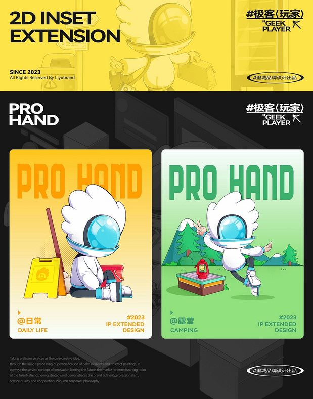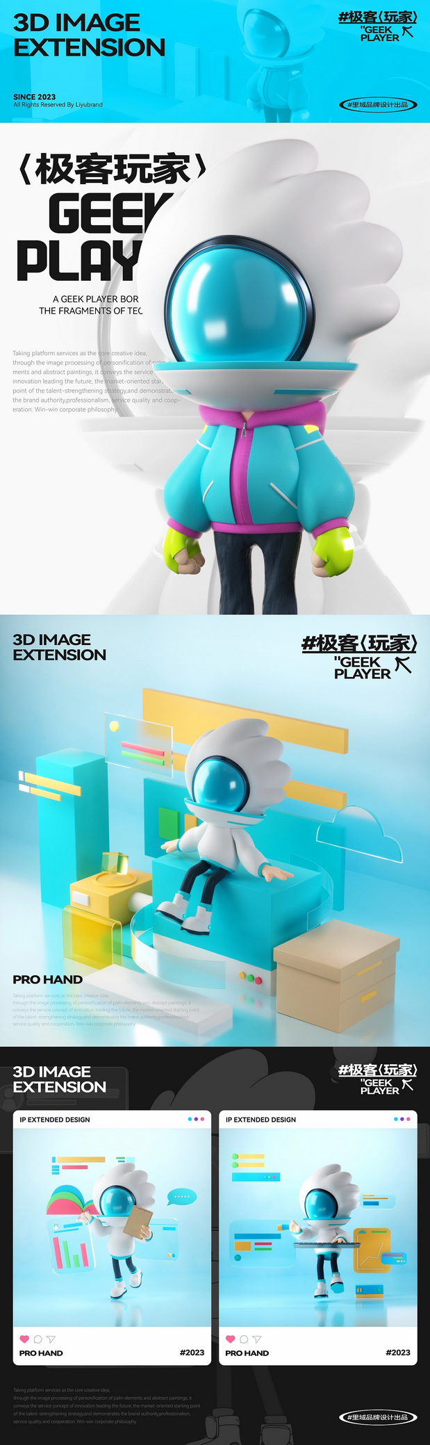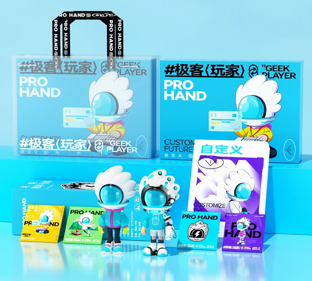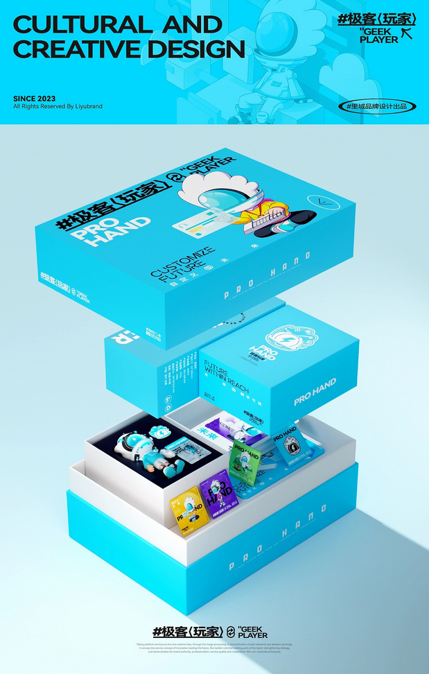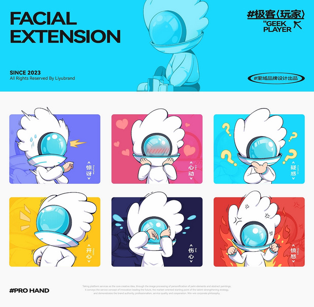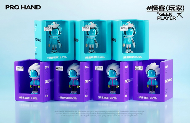 IP形象设计 Project | 极客玩家-PRO HAND 新玩法新机遇-科技行业IP化势如破竹 越来越多的科技品牌选择采用识别度高、记忆点强的IP形象作为自己品牌产品的发声人,通过迎合年轻人对趣味性、新鲜感与社交属性的偏好,依托IP形象,打造全新商业宣传模式,引起年轻人自发传播,为科技行业的营销玩法带来新的机遇。 极客玩家-玩转科技一把手PRO HAND 玩转科技一把手,由无数科技碎片中出悄然诞生。常听说因恋爱上头的叫恋爱脑,那PRO HAND这个只对科技上头的极客玩家,可谓名副其实的科技脑。以手掌形状为头部造型,传达掌控科技力量,未来触手可得;科技面具强化IP属性,展现IP科技与智能属性;数智托盘,传递一站式数智科技服务理念;科技蓝与天际白的配色,打造IP未来感的视觉识别属性,强化IP“数字+科技”的特征。 美术指导 Art Director丨Perry 项目编辑 Project Editing 丨伟智 插画设计 Illustration Designer 丨子维 平面设计 Graphic Designer丨伟智 策划文案 Steategic Planing丨诗倩 / Rex 三维设计 3D Designer丨泰星