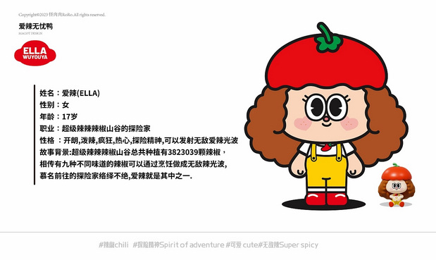 爱辣无忧鸭IP /><img fetchpriority= 超级辣辣辣椒山谷总共种植有3823039颗辣椒,相传有九种不同味道的辣椒可以通过烹饪做成无敌辣光波,慕名前往的探险家络绎不绝,爱辣就是其中之一.无忧鸭是爱辣探险途中救下来的小鸭子,虽然贱贱的,但是他的“每日开心”哲学影响了很多人.原创IP,可授权
