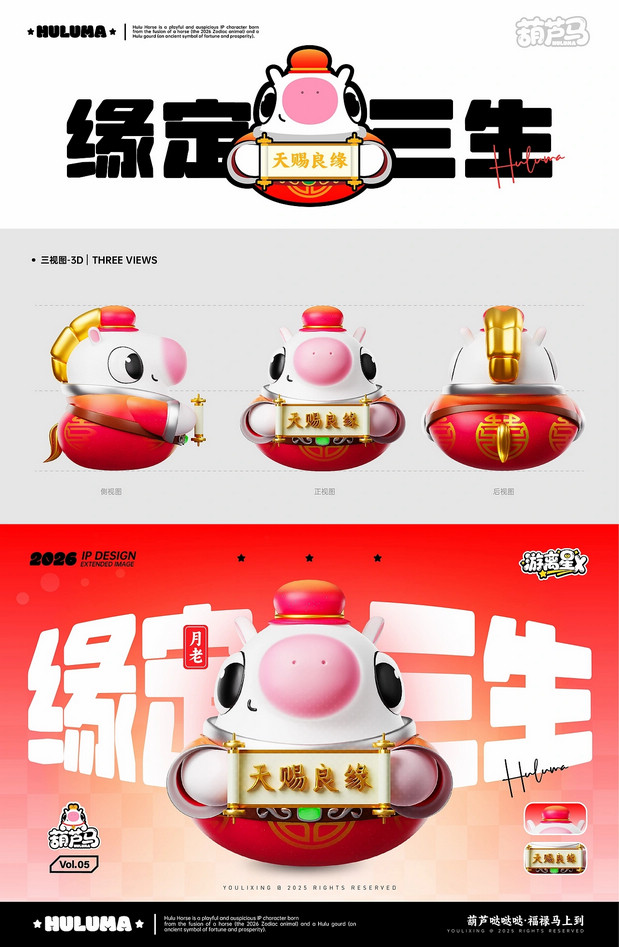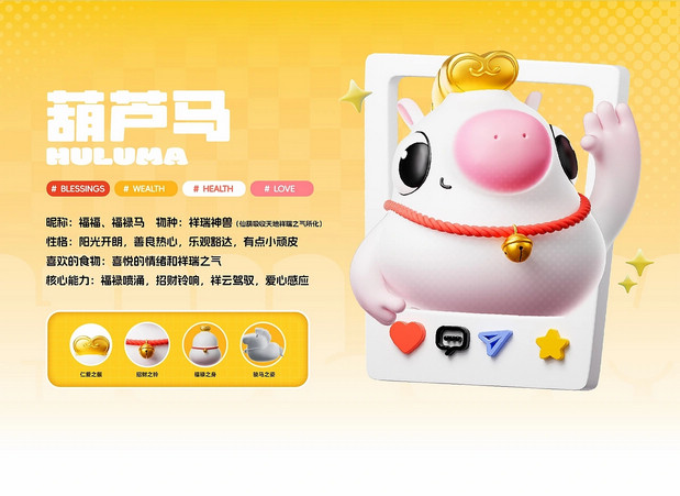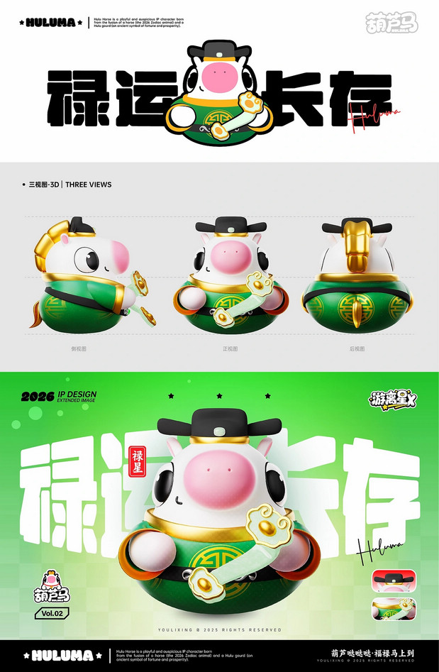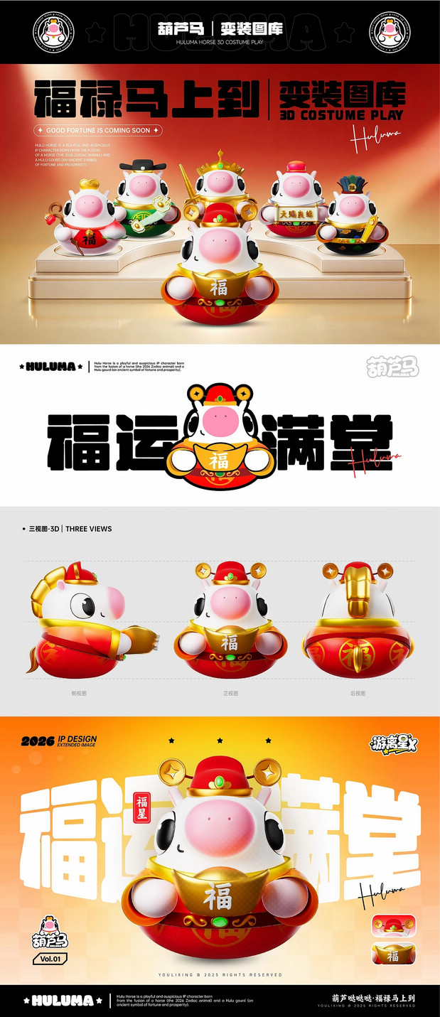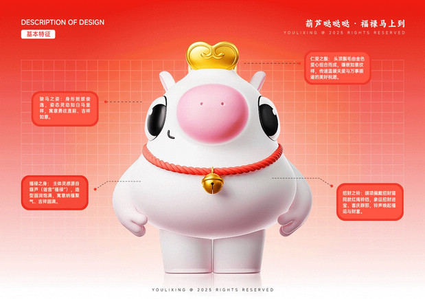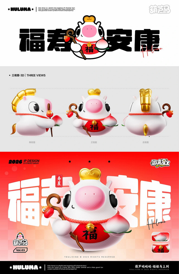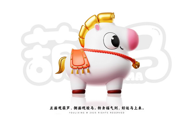福禄马上到·马年IP形象 /><img fetchpriority= 正面观葫芦·侧面现骏马   转身福气到·好运马上来 正面看,它是圆润可爱的吉祥葫芦;侧面瞧,又能发现它藏着矫健白马的灵动线条。当你转动它,福气仿佛随之环绕;看它昂首跃起,好运便如腾云般扑面而来。这就是福禄马——既有葫芦带来的“福禄”寓意,又充满骏马的朝气与活力。愿这匹小马陪伴你的马年,福气满满,万事顺意。 IP Designer:游离星X 设计内容:平面 | 三维 | 产品 | 美陈 IP可授权,可买断(所有内容都可授权,授权后可根据用户需求调整,包括尺寸、颜色等…) 注:原创IP形象已注册版权,未经允许请勿私自转载商用等