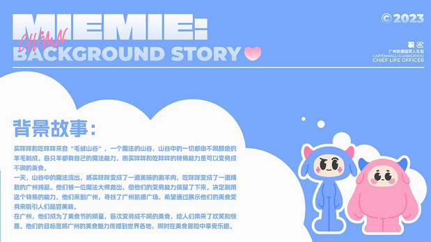 -很开心参与这次凯德IP项目升级的邀请 -本提案为凯德IP项目升级投标方案 “最终解释权归凯德广场·云尚” -买咩咩和吃咩咩来自“毛绒山谷”,一个魔法的山谷,山谷中的一切都由不同颜色的羊毛制成。每只羊都有自己的魔法能力,而买咩咩和吃咩咩的特殊能力是可以变身成不同的美食。一天,山谷中的魔法流出,将买咩咩变成了一道美味的涮羊肉,吃咩咩变成了一道精致的广州炖品。他们被一位魔法大师救出,但他们的变身能力保留了下来。决定利用这个特殊的能力,他们来到广州,寻找了广州凯德广场,希望通过展示他们的美食变身来吸引人们品尝美味。在广州,他们成为了美食节的明星,每次变身成不同的美食,给人们带来了欢笑和惊喜。他们的目标是将广州的美食魅力传播到世界各地,同时在美食冒险中享受乐趣。