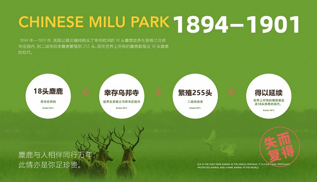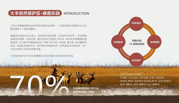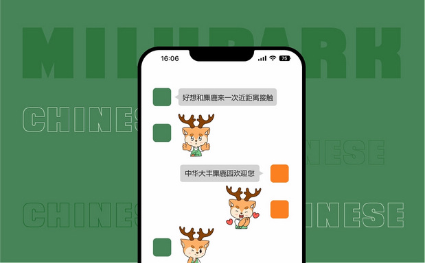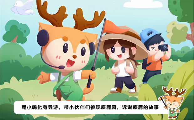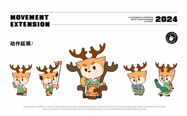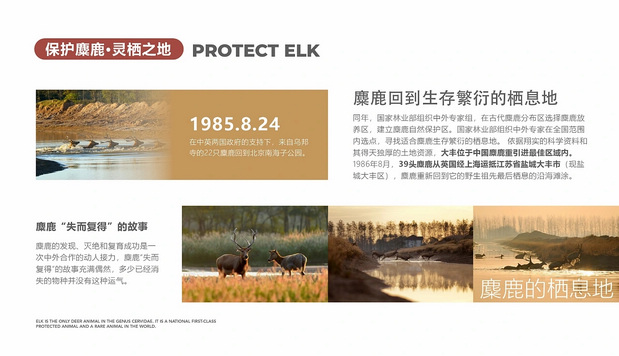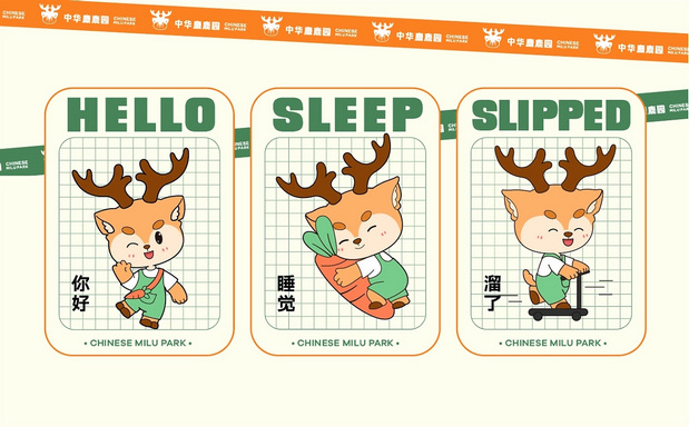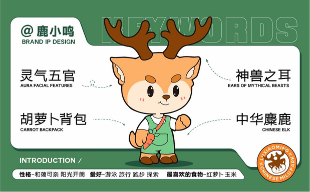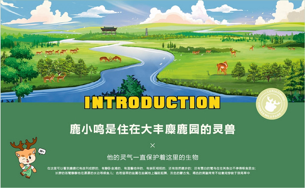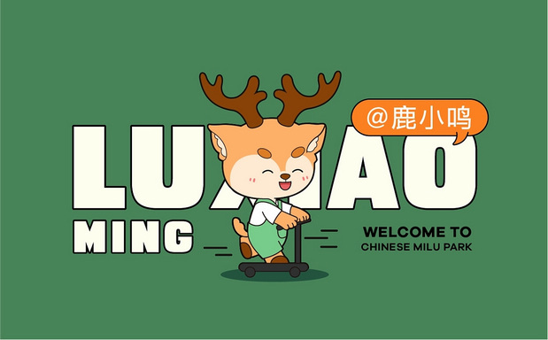 中华麋鹿园区是全球唯一、中国仅有的以麋鹿文化为主题的国家5A级旅游景区。除麋鹿外,保护区还有兽类27种,鸟类204种,两栖类和爬行类21种,鱼类156种、昆虫599种,棘皮动物10种、环节动物62种,腔肠动物6种、浮游动物98种。其中国家一、二级保护动物41种。 中华麋鹿园已被列入国际重要湿地名录、东亚-澳大利西亚鸻鹬鸟类迁徙网络和人与生物圈保护区网络,成为全球环境基金(GEF)中国项目示范区、中国生物多样性保护示范基地、全国示范自然保护区、全国科普教育基地、全国未成年人生态道德教育先进集体等光荣称号。 麋鹿又名“四不像”,似鹿非鹿,似马非马,似牛非牛,似驴非驴。但是最特别的还是它的鹿角,倒置在同一平面上可以站立不倒,这是区分于驯鹿、梅花鹿等形象一大特点。所以在形象设计中,我们结合这些属性,在鹿角同一水平上还融入了”小爱心“让形象更可爱。麋鹿非常喜欢吃胡萝卜,背着胡萝卜包包,灵动有趣。